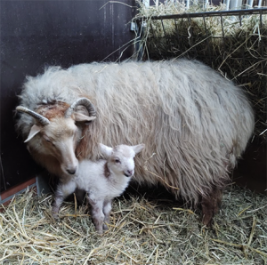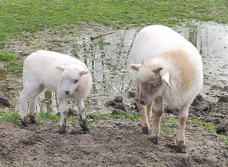 En soms zijn er kleintjes. Aaaaaw…. Lammetje Leendert was er dit jaar in maart al! Op foto 1 staat hij bij moeder Ciske, onze Drentse schone. Op foto 2 zie je Leendert met zijn zusje Lotje (links). Zijn het geen knapperds?